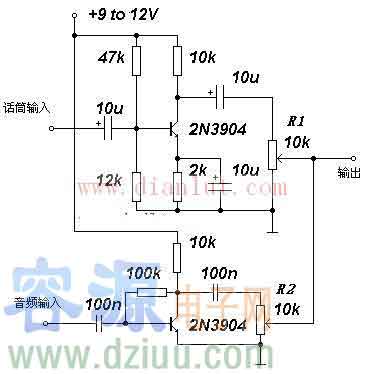 在音頻電路的業余電子制作中,往往需要把兩種音頻電信號混合為一路音頻電信號,這時就可以自制一個音頻二混合器來解決。如圖給出的二混合器電路簡單,全部由分立元件組成,元件易購,效果也較為理想。 :