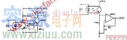 電路采用耦合器將開關電路輸入信號與開關電路輸出信號相互隔離,可降低輸出脈沖尖峰。電路中用兩個光耦合器,表示斬波器,輸入信號可正也可負。?A741是運算放大器,增益為R2/R1,可提高輸出信號的幅度。 電路