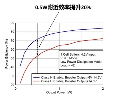 這里重點介紹的就是CLASS H的顯著作用。CLASS H就是根據音樂信號動態調整升壓。傳統的方式是DCDC升壓到一個固定電壓,比如15V,從電池電壓升壓到15V,升壓芯片的壓力會比較大,就像跨臺階一樣,跨的越大壓力越大,效率會大幅降低,從而帶來的發熱量大幅增加。這種傳統固定升壓的方案,使得這種DCDC壓力得不到釋放,不管音樂信號平均幅度是多小,升壓芯片都要維持低效率狀態,發熱量也得不到降低。音頻功放也是面臨一樣的挑戰,傳統方案不管音樂信號大小,功放的電源都是固定高電壓,輸出PWM波形的高電平就是高電壓。同樣輸出1W,9V和18V供電效率差別還是很大的。CLASS H功能替代這種固定升壓的方案,必將成為新一代便攜式產品的趨勢。