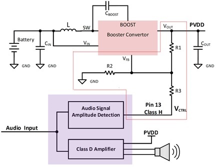 ACM31XX系列音頻功放內置動態升壓檢測功能,通過GlassH管腳輸出對外接DC-DC升壓IC的FB腳控制信號。實現信號大小智能跟蹤,動態升壓,達到明顯提高效率的效果。以下應用說明: