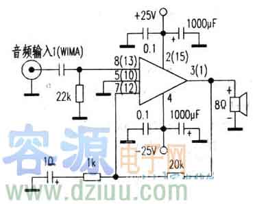 此電路簡(jiǎn)單、價(jià)廉,可用一對(duì)TO-220單塊達(dá)林頓晶體管構(gòu)成推挽輸出級(jí),頻響在30Hz到200kHz內(nèi)偏差小于1dB,諧波失真低于0.2%。在8Ω負(fù)載上20W滿輸出時(shí)放大器僅需輸入有效值1.2V的電壓。本電路僅需外加一個(gè)晶體管,