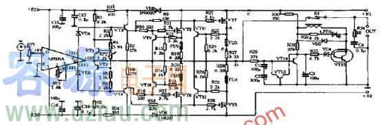 該電路由VT1、 VT2組成差動放大電路,每管靜態電流約為0.5mA,R3為VT1的集電極負載電阻,VT1與推動級VT4之間為直接耦合。輸出級由兩只型號相同的 NPN型大功率晶體管VT5、VT6組成,而沒有采用互補對稱推挽電路。
