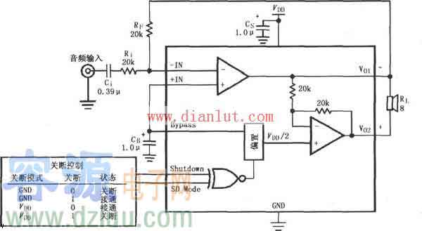工作原理:音頻信號輸入后,經過Ci、Ri耦合加到放大器的反相輸入端(5腳),而放大器的同相輸入端(4腳)則通過CB交流接地,功率放大后從Vo1(6腳)和Vo2(10腳)以電橋輸出的形式加到揚聲器。LM4901內部有兩個