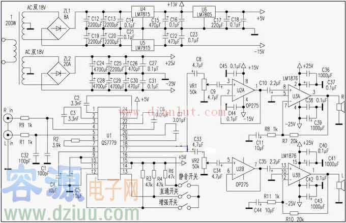 本電路相當簡潔,音效處理采用加拿大QSOUND公司的單片QS7779虛擬環繞電路。由于該電路內置了杜比定向邏輯和杜比數碼混合信號解碼器。不僅能使普通的立體聲信號進行效果增強,當播放的是DVD的杜比數碼信號時也能