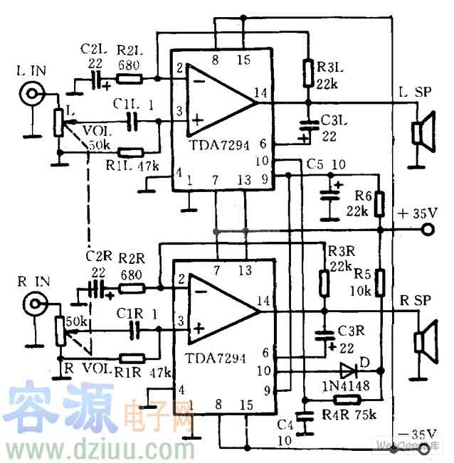 集成電路tda7294結成的100W功率放大器電路