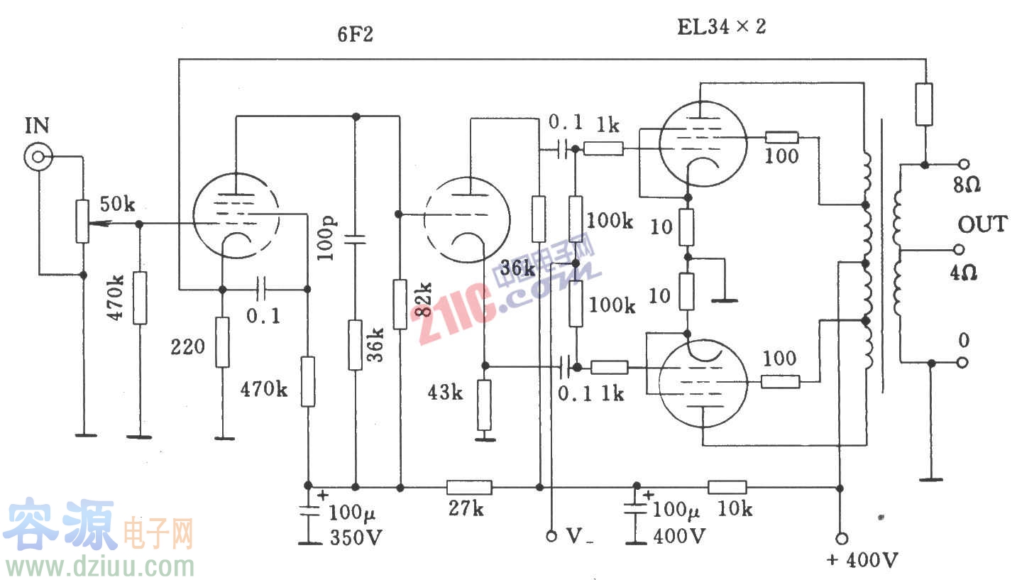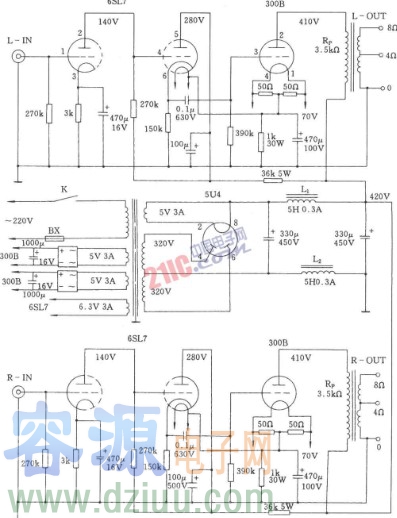 如圖所示為合并式單端A類電子管功放電路圖,本電路輸出功率:8W×2輸出阻抗:4Ω、8Ω輸入靈敏度:l.4V失真系數(shù):2%頻率響應(yīng):25Hz-20kHz-3dB。電源功耗:120W。 :