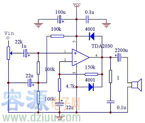 最簡單2030功放電路圖,TDA2030A是德律風(fēng)根生產(chǎn)的音頻功放電路,采用V型5 腳單列直插式塑料封裝結(jié)構(gòu).如圖1所示,按引腳的形狀引可分為H型和V型.該集成電路廣泛應(yīng)用于汽車立體聲收錄音機(jī)、中功率音響設(shè)備,具有體積小、輸出功率大、失真小