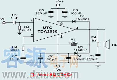 1.TDA2030具有負(fù)載泄放電壓反沖保護(hù)電路,如果電源電壓峰值電壓40V的話,那么在5腳與電源之間必須插入LC濾波器,以保證5腳上的脈沖串維持在規(guī)定的幅度內(nèi)。