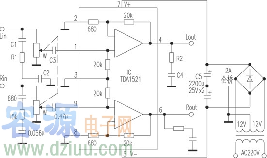 TDA1521制作實(shí)用微型功放 本功放元件少、制作簡單、音質(zhì)好,非常適合裝入有源音箱內(nèi).效果理想,成本也低,該功放IC選用TDA1521,當(dāng)電源電壓為±16V時,輸出功率為12W×2,此時失真度僅為0.5%,并具有開/關(guān)機(jī)靜噪功能.本電