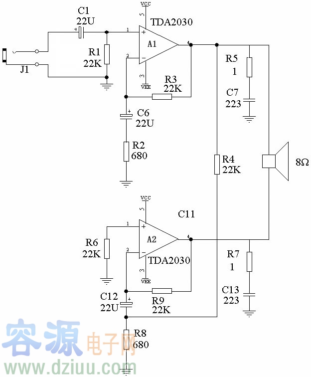 lm380集成功放電路圖:有了這個簡單的電路圖,你可以使用立體聲來驅(qū)動一個8Ω的揚(yáng)聲器。