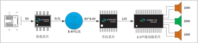 深圳市永阜康科技有限公司推出基于CS8611E單芯片移動2.1聲道藍牙音箱解決方案。采用雙節鋰電池串聯8.4V做電源,再加一個升壓芯片CS5036E升壓到12V給CS8611E供電,實現20W+2×10W輸出;而充電采用CS5090E USB 5V輸入兩節鋰電池串聯8.4V充電管理芯片,非常方便。在鋰電池為電源的狀態下提供媲美傳統2.1音箱的聽覺體驗。