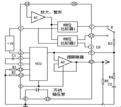 輸入信號 Ui從14腳輸入后,經放大器A1進行放大、整形后加到相位比較器Ⅰ、Ⅱ的輸入端,開關K撥至2腳,則比較器Ⅰ將從3腳輸入的比較信號Uo與輸入