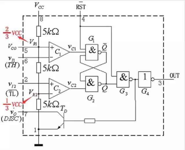 它內部包括兩個電壓比較器,三個5K等值串聯電阻,一個 RS 觸發器(由G1和G2構成),一個放電三極管T 及功率輸出級。它提供兩個基準電壓VR2(1/3 VCC) 和VR1(2/3 VCC),如下圖所示。