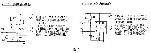 第2種(見圖2)是施密特觸發電路,有最簡單形式的(2.2.1)和輸入端電阻調整偏置或在控制端(5)加控制電壓VCT以改變閥值電壓的(2.2.2)共2個單元電路。