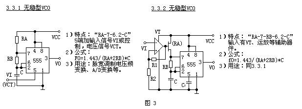 第3種(圖3)是壓控振蕩器。單穩型壓控振蕩器電路有很多,都比較復雜。為簡單起見,我們只把它分為2個不同單元。不帶任何輔助器件的電路為1.3.1;使用晶體管、運放放大器等輔助器件的電路為1.3.2。圖中列出了2個常用電路。