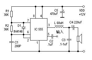 由IC 555和R1、R2、C1等組成100KHz可控多諧振蕩器,占空比為50%,控制端5腳輸入音頻信號(hào),3腳便得到脈寬與輸入信號(hào)幅值成正比的脈沖信號(hào),經(jīng)L、C3接調(diào)、濾波后推動(dòng)揚(yáng)聲器。