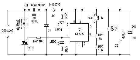 電路如圖所示。圖中IC為NE555時(shí)基電路。RP3為溫控調(diào)節(jié)電位器,其滑動(dòng)臂電位決定IC的觸發(fā)電位V2和閥電位Vf,且V5=Vf=2Vz。220V交流電壓經(jīng)C1、R1限流降壓,D1、D2整流、C2濾波,DW穩(wěn)壓后,獲得9V左右的電壓供IC用。室溫下接通電源,因已調(diào)V2Vz,V6≥Vf時(shí),IC翻轉(zhuǎn),3腳變?yōu)榈碗娖剑珺CR截止,電熱絲停止發(fā)熱,溫度開始逐漸下降,BG1的ICEO隨之逐漸減小,V2、V6降低。當(dāng)V6元件選擇: