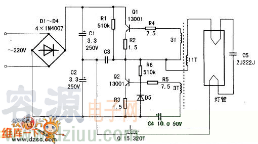 本電路特點(diǎn)是全部應(yīng)用散器件制作,沒(méi)有用到集成電路,其主要器件是13001三極管作為控制器件,電路元器件少,制作簡(jiǎn)單,制作成功率高,電路圖如下: