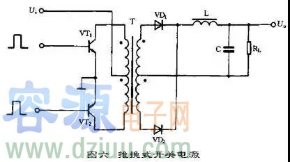 推挽式開關電源的典型電路如圖六所示。它屬于雙端式變換電路,高頻變壓器的磁芯工作在磁滯回線的兩側。電路使用兩個開關管VT1和VT2,兩個開關管在外激勵方波信號的控制下交替的導通與截止,在變壓器T次級統組得到方波電壓,經整流濾波變為所需要的直流電壓。