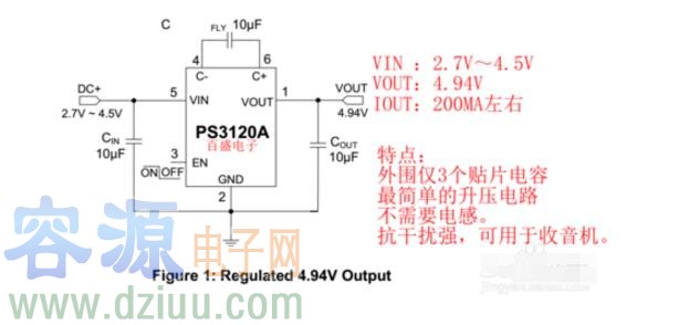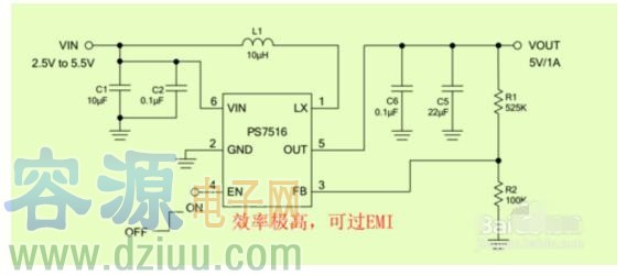 1,同步整流升壓PS7516,特點:效率普遍90%及以上,外圍少