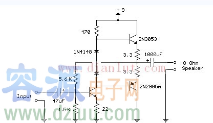 本電路是一個小的音頻放大器類似于一個小的晶體管收音機。輸入級可偏置電壓,使供應分在兩個互補輸出是略微偏導基地之間的二極管三極管平分。 3.3歐姆的電阻串聯使用,輸出晶體管的發射極穩定的偏置電流,因此不
