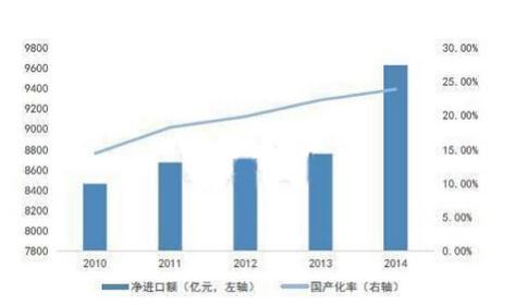 據報告顯示,截止2014年,我國IC產業國產化率(國內IC銷售額/(IC凈進口額+國內IC銷售額))不足25%。雖然過去5年,國產化率處于不斷提升的過程中,但仍存在較大國產化替代空間。受益于信息安全上升為國家戰略以及各部委國產化替代進程的加速,IC產業國產化替代進程有望加速。