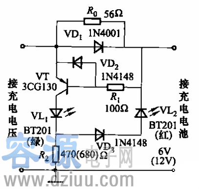 充電時,綠色發光二極管VLi亮;電池充足后,紅色發光二極管VLz亮。