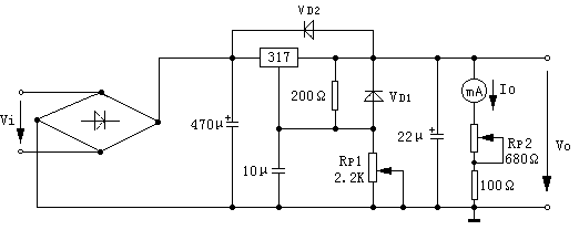 電路工作原理:220V交流電經(jīng)變壓器T降壓后,得到24V交流電;再經(jīng)VD1~VD4組成的全橋整流、C1濾波,得到33V左右的直流電壓。該電壓經(jīng)集成電路LM317
