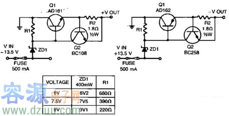 低電壓調(diào)節(jié)器短路保護(hù)電路,可提供6,7.5,和9 V從13.5 V標(biāo)稱值,然而,他們將功能一樣好,如果連接到一個平滑的直流輸出變壓器/整流電路的汽車電池供電。 兩種類型的正反兩方面的地面系