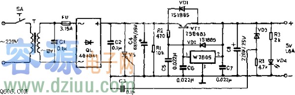 接通電源,電網電壓220V經變壓器T變壓,由橋式整流器QL整流、電容C3濾波,使輸出端得到5V的穩定電壓。W7805的最大輸出電流為1.5A,要想使輸出電流達到>1.5A,則要擴大輸出電流。這此,在W