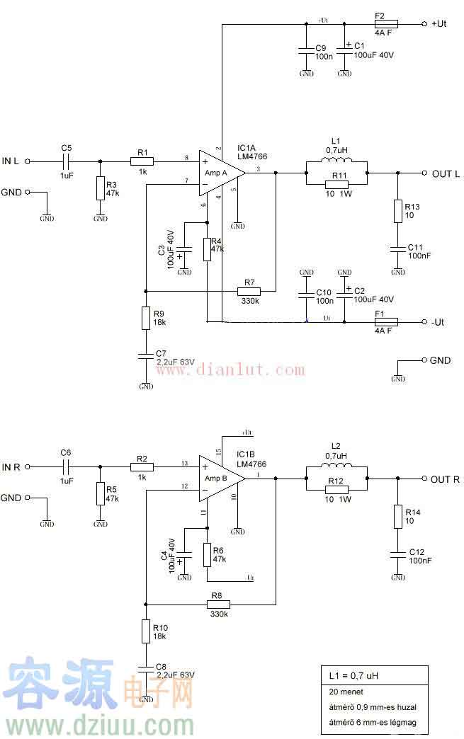 LF353的應用電路圖:甲類功放(A類功放)輸出級中兩個(或兩組)晶體管永遠處于導電狀態,也就是說不管有無訊號輸入它們都保持傳導電流,并使這兩個電流等于交流電的峰值,這時交流在最大訊號情況下流入負載.當無訊號時,兩個晶體管各流通等