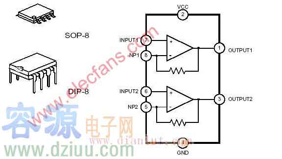 2822是專門用于便攜式錄音機和收音機的音頻功率放大輸出部分的雙極性集成電路,具有交流失真小,靜態電流小,開關機時無沖擊噪聲等特點。下圖為它的內部等效原理圖。 :