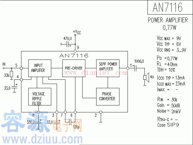 下面是采用松下功放芯片AN7117功放應用電路圖。 功放參數如下: 功作電壓:直流3V-9V 輸出功率:0.77W 負載:4 Ohm TDH=10% 增益:50dB :