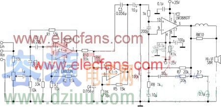 本電路設計的音頻功率放大器高質量低花費,不僅可用于汽車上,也可用于小型便攜式音樂中心。該功率放大器是低通道沒有附加另外的放大器,低頻通道的揚聲器經濾波器接到二個立體聲通道的輸出端,其中一個信號反