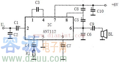 如圖所示,為0.5W單聲道OTL放大電路。 IC采用了OTL音頻功放集成電路AN7112.AN7112為單列9腳式封裝,②腳為音頻信號輸入端,⑥腳為功率信號輸出端,閉環電壓增益為50dB,滿功率輸出時輸入信號Ui=6mV,采用+6V單