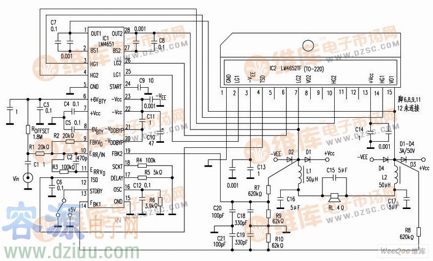 用美國國家半導體公司新推出的LM4651和LM4652設計的125W D類超低音功率放大器電路如圖所示。該放大器在總諧波失真THD=1%下的輸出功率為125W,負載阻抗RL=4Ω,輸入信號Vin(rms)最高電平為3V,輸入信號帶寬為1