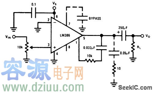 使用在引腳1和5之間的外部串聯RC電路和運放器的并聯內部151K電阻,對揚聲器的低音響應差補償。如果電阻是15K,穩定運行的最低值是10K,就可以得到6分貝的有效低音增強。 :